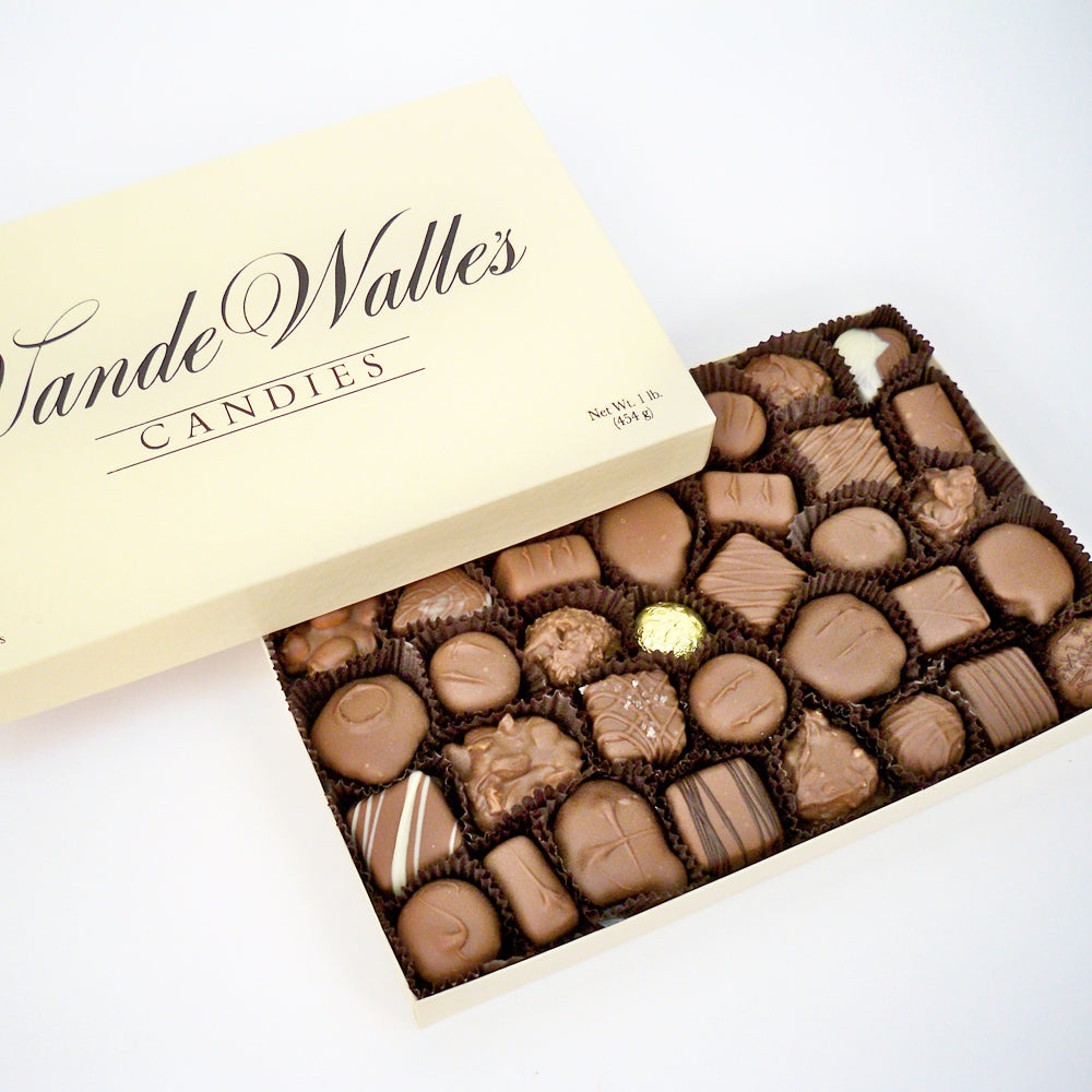 The Georgetown gift box is our most popular gift box, and it is easy to see why. This beautiful gift box contains one half pound each of our award-winning soft and chewy wrapped caramels, Heavenly Angelfood Candy, deluxe mixed nuts and assorted milk and dark chocolates. Makes a great hostess or thank you gift.