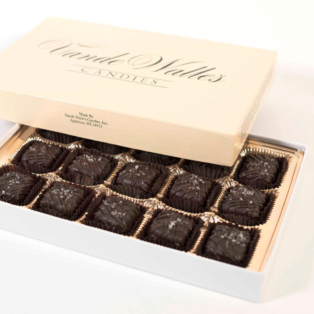 Rich milk chocolate, luscious dark chocolate and Vande Walle's soft, chewy, award-winning vanilla caramel topped with pure ocean sea salt combine to create an inspiring sweet and savory confection.   Your friends, family, and gift recipients will all truly enjoy these superb confectionery delights.