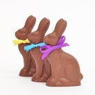 Solid milk, dark, or white chocolate bunny rabbit with a satin ribbon bow tied around its neck. Packaged in a clear cello bag with a bow.