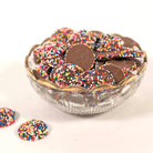 A treat for all ages. Rich milk chocolate disks topped with colored non-pareils. Packaged in clear cello bags and tied with a pretty bow. The bow changes with the seasons and holidays. A great personal treat. Makes a much appreciated hostess gift. Eight ounces per bag.