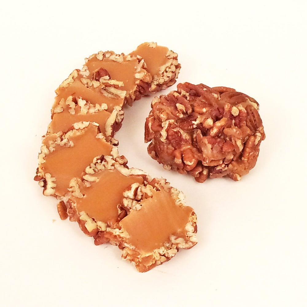 Our Pecan Caramel Logs are made with a caramel center, dipped in more caramel, and then rolled in Georgia pecan halves. We make them in three different size ranges: 3-1/2 ounce to 4 ounce, 7-1/2 ounce to 8-1/2 ounce, and 11 ounce to 12 ounce. These logs are cut and dipped by hand, so there is a bit of variation from log to log. Packaged in a clear cello bag for home enjoyment. The 12 ounce burgundy gift box makes a fantastic gift!